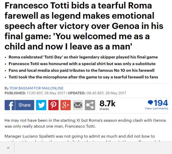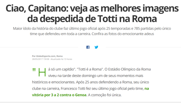 Si è chiusa ieri la carriera da giocatore nella Roma di Francesco Totti. La celebrazione finale ai 25 anni di carriera del capitano giallorosso trova, come prevedibile, una vasta eco anche al di fuori dei confini nazionali. E il numero 10 trova parole d'elogio per la sua straordinaria carriera sulle pagine delle principali testate straniere.