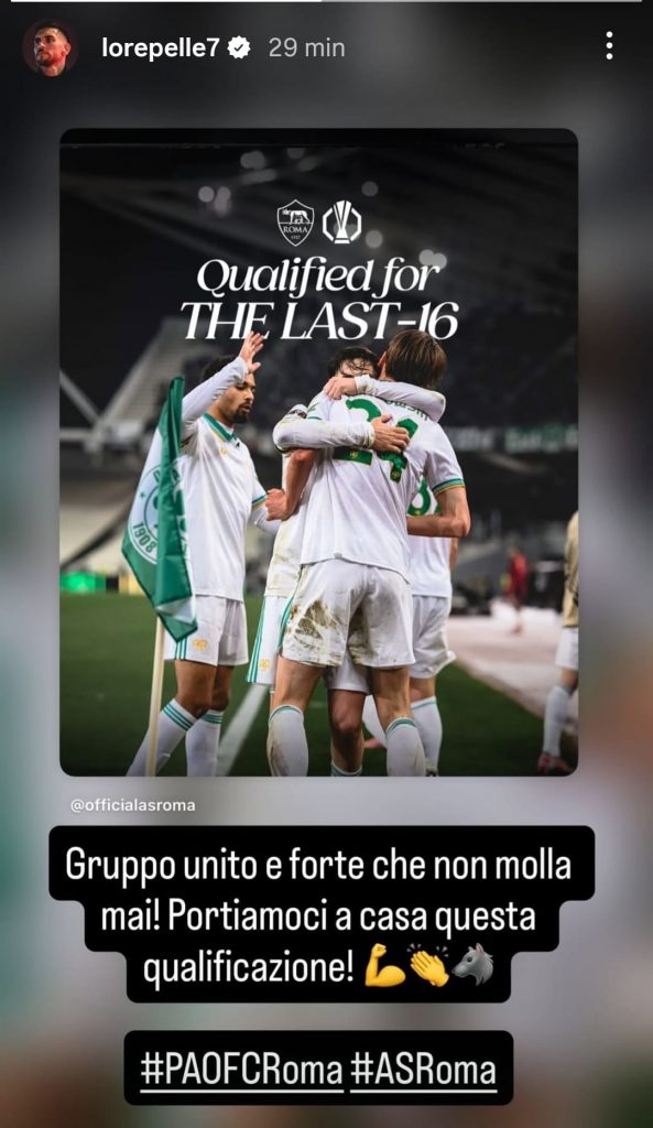 Lorenzo Pellegrini ha celebrato con una storia sul proprio profilo Instagram il passaggio del turno della Roma agli ottavi di finale di Europa League. Queste le sue parole: "Gruppo unito e forte che non molla mai! Portiamoci a casa questa qualificazione!".