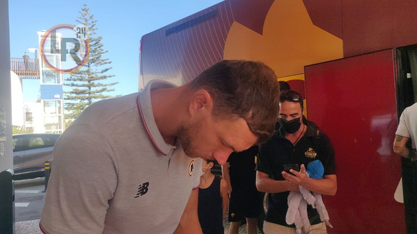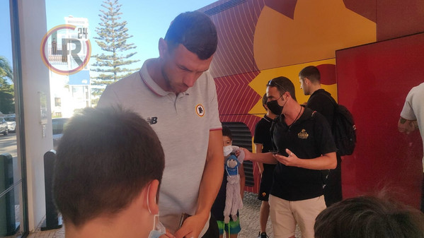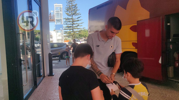 09.58 - La squadra raggiunge il pullman della Roma e, prima di salire a bordo, alcuni calciatori si intrattengono con i tifosi presenti per selfie e autografi di ordinanza