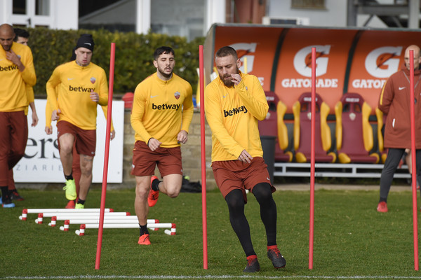 DA TRIGORIA DAMIANO FRULLINI - Alla vigilia del match di Champions League con il Porto la Roma scende in campo al Fulvio Bernardini per la seduta di rifinitura. Per la gara di domani i giallorossi ritrovano Manolas al centro della difesa, mentre è ancora in dubbio la presenza di Olsen tra i convocati.